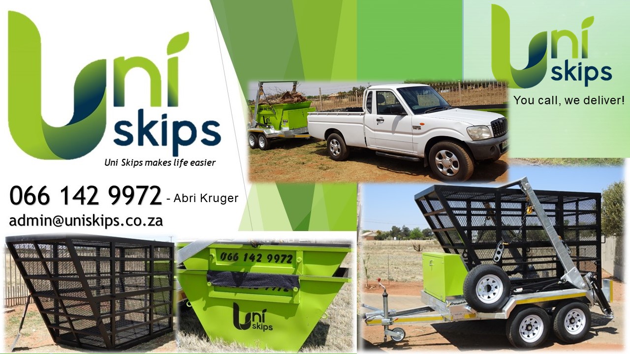 Welcome to Uniskips, the preferred supplier of skip bins and cages in Bloemfontein. We make life easier by offering you the opportunity to rent one of our skips or cages. Whether it is household refuse, garden or building ruble or material you need which you need to transfer from one premises to another you are welcome rent one of our skips. If you have carton or paper at your office or home that you want to dispose of but you do not necessarily want it to be blown around by the wind then our enclosed cages is definitely the option you want to consider. Rent one of our cages today from only R 350.00 and we will deliver and collect it in and around Bloemfontein. Our contact details are displayed in the image below or alternatively simply visit our contact page and complete the contact form and we will contact you. You can also reach us by Whats app or by visiting our Facebook page. Be sure to also visit our terms and conditions page to read the terms and conditions for hiring one of our cages.